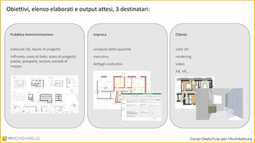 Il corso ha come obiettivo mostrare l'utilizzo di SketchUp per lo svolgimento di un intero progetto dalla costruzione dello stato di fatto, passando dalla costruzione dello stato di progetto fino alla redazione dei vari elaborati finali (fra cui tavola del raffronto, adattabilità, impianti, dettagli/esecutivo/computo, abachi finestre e altri ancora).
